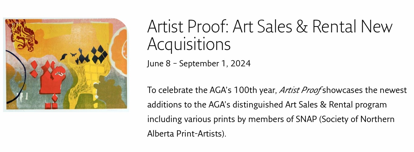 Artist Proof Art Sales and Rentals Gallery at AGA, Edmonton, AB. June 8 to Sept.1, 2024