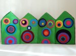 I like the tactile feel of felt, buttons, beads and thread. I like the bright colours. I like the activity of cutting and stitching. Some of these pieces were made on trips – on trains, planes, and in hotels. They are conversations that run through my head when I am staring out a window, conversations I wished I’d had, conversations I have overheard, conversations I have revised in the recollection of them. Here they are in coloured shapes, buttons, beads, and thread stitches.